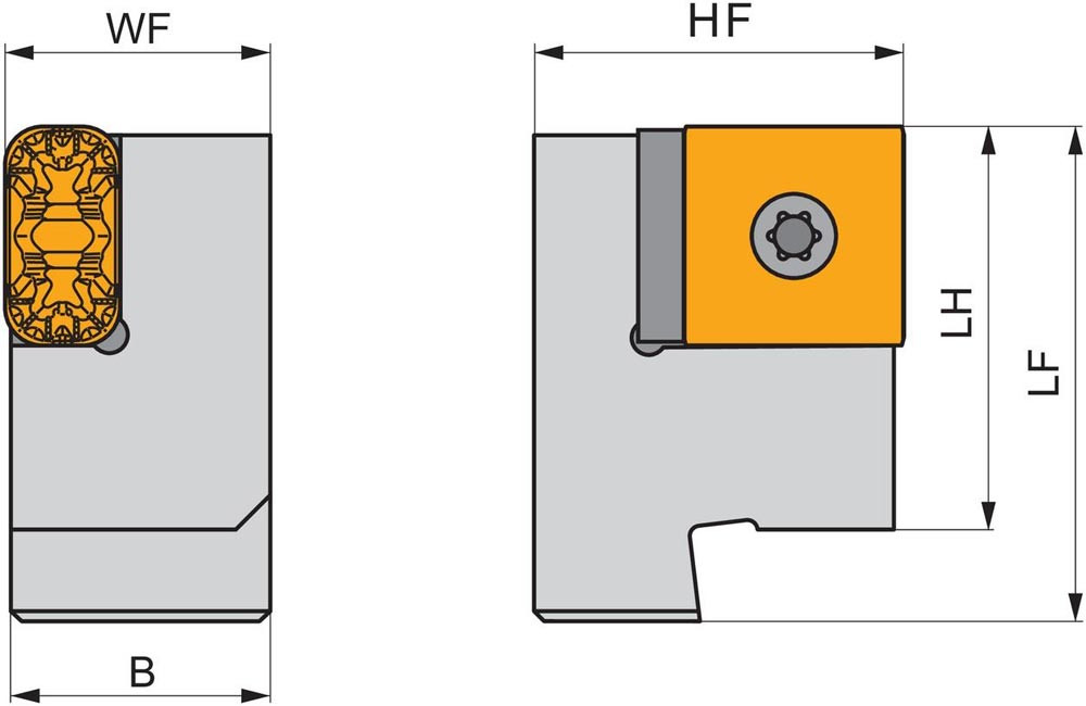 Modular Drehsystem mit Knieheblklemmung zum spannen von Rechteckig negative Wendeschneidplatten mit einer Hauptschneidenlänge von 19.05mm (ISO Bezeichnung LN.X 1919.. ) · für die Radsatzbearbeitung · zur Montage mit DKTL 5055 X (A1/A2) für Kegeldrehen und Längsdrehen ohne Schulter