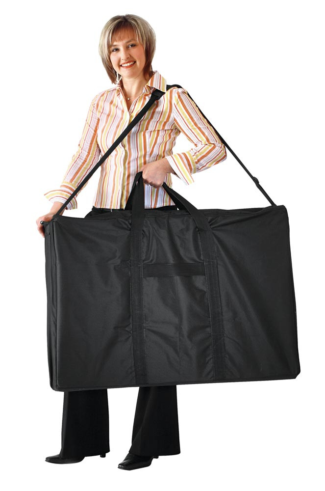 Die mit Klettbändern befestigte obere Hälfte kann komplett umgeklappt werden. Mit einer Höhe von 905 mm und einer Tiefe von 160 mm kann sie so auf kleinstem Raum transportiert und gelagert werden