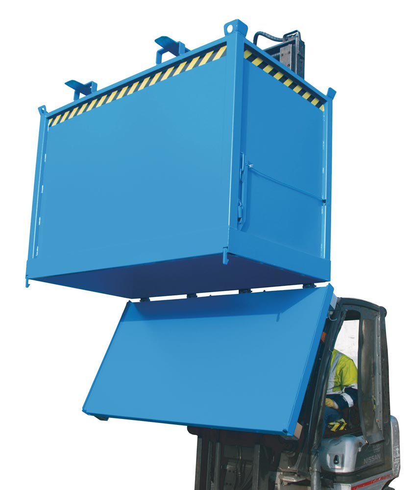∙ Entriegelung der Bodenklappe per Seilzug vom Stapler aus ∙ Bodenklappe schließt beim Aufsetzen selbsttätig, 90° Öffnungsbereich ∙ Sicherung für Bodenklappe gegen Abrutschen und ungewünschtes Öffnen ∙ Aufnahme für Gabelstapler und Kran sowie mit Gabelhubwagen transportierbar ∙ Robuste Stahlblechkonstruktion: Wandstärke 3 mm, Bodenklappenstärke 4 mm ∙ Einfahrbügel an der Oberseite des Behälters, Einfahrtaschen an der Unterseite · Unterfahrhöhe 100 mm
