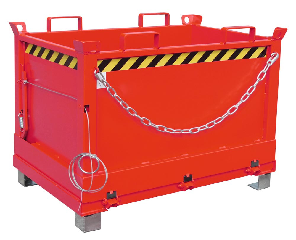 ∙ Entriegelung der Bodenklappe per Seilzug vom Stapler aus ∙ Bodenklappe schließt beim Aufsetzen selbsttätig, 90° Öffnungsbereich ∙ Sicherung für Bodenklappe gegen Abrutschen und ungewünschtes Öffnen ∙ Aufnahme für Gabelstapler und Kran sowie mit Gabelhubwagen transportierbar ∙ Robuste Stahlblechkonstruktion: Wandstärke 3 mm, Bodenklappenstärke 4 mm ∙ Einfahrbügel an der Oberseite des Behälters, Einfahrtaschen an der Unterseite · Unterfahrhöhe 100 mm