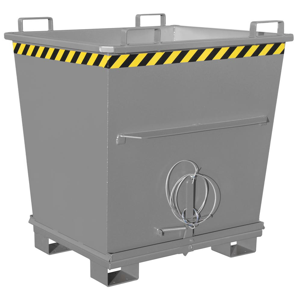 ∙ Entriegelung der Bodenklappe per Seilzug vom Stapler aus ∙ Bodenklappe schließt beim Aufsetzen selbsttätig, 90° Öffnungsbereich ∙ Sicherung für Bodenklappe gegen Abrutschen und ungewünschtes Öffnen ∙ Aufnahme für Gabelstapler und Kran sowie mit Gabelhubwagen transportierbar ∙ Robuste Stahlblechkonstruktion: Wandstärke 3 mm, Bodenklappenstärke 4 mm ∙ Einfahrbügel an der Oberseite des Behälters, Einfahrtaschen an der Unterseite · Unterfahrhöhe 100 mm