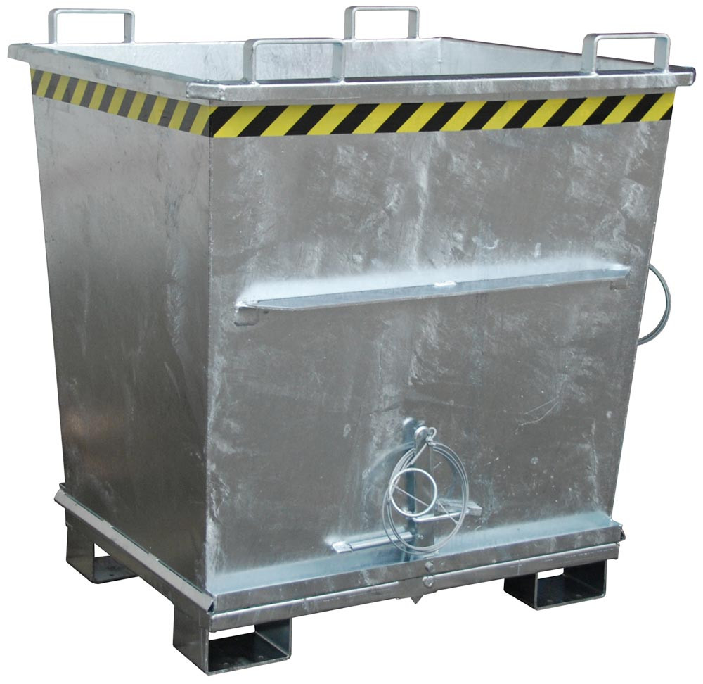 ∙ Entriegelung der Bodenklappe per Seilzug vom Stapler aus ∙ Bodenklappe schließt beim Aufsetzen selbsttätig, 90° Öffnungsbereich ∙ Sicherung für Bodenklappe gegen Abrutschen und ungewünschtes Öffnen ∙ Aufnahme für Gabelstapler und Kran sowie mit Gabelhubwagen transportierbar ∙ Robuste Stahlblechkonstruktion: Wandstärke 3 mm, Bodenklappenstärke 4 mm ∙ Einfahrbügel an der Oberseite des Behälters, Einfahrtaschen an der Unterseite · Unterfahrhöhe 100 mm