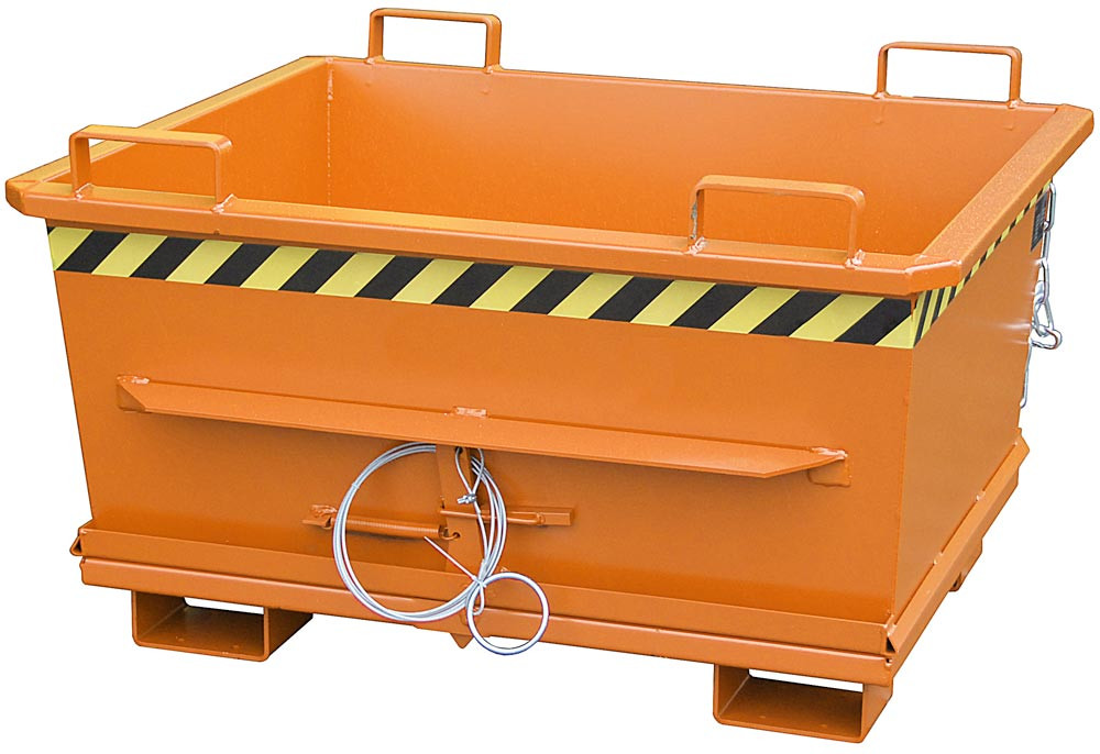 ∙ Entriegelung der Bodenklappe per Seilzug vom Stapler aus ∙ Bodenklappe schließt beim Aufsetzen selbsttätig, 90° Öffnungsbereich ∙ Sicherung für Bodenklappe gegen Abrutschen und ungewünschtes Öffnen ∙ Aufnahme für Gabelstapler und Kran sowie mit Gabelhubwagen transportierbar ∙ Robuste Stahlblechkonstruktion: Wandstärke 3 mm, Bodenklappenstärke 4 mm ∙ Einfahrbügel an der Oberseite des Behälters, Einfahrtaschen an der Unterseite · Unterfahrhöhe 100 mm