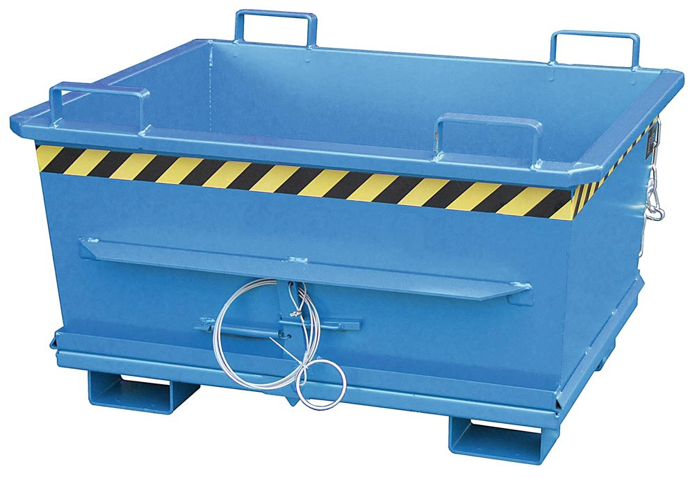 ∙ Entriegelung der Bodenklappe per Seilzug vom Stapler aus ∙ Bodenklappe schließt beim Aufsetzen selbsttätig, 90° Öffnungsbereich ∙ Sicherung für Bodenklappe gegen Abrutschen und ungewünschtes Öffnen ∙ Aufnahme für Gabelstapler und Kran sowie mit Gabelhubwagen transportierbar ∙ Robuste Stahlblechkonstruktion: Wandstärke 3 mm, Bodenklappenstärke 4 mm ∙ Einfahrbügel an der Oberseite des Behälters, Einfahrtaschen an der Unterseite · Unterfahrhöhe 100 mm