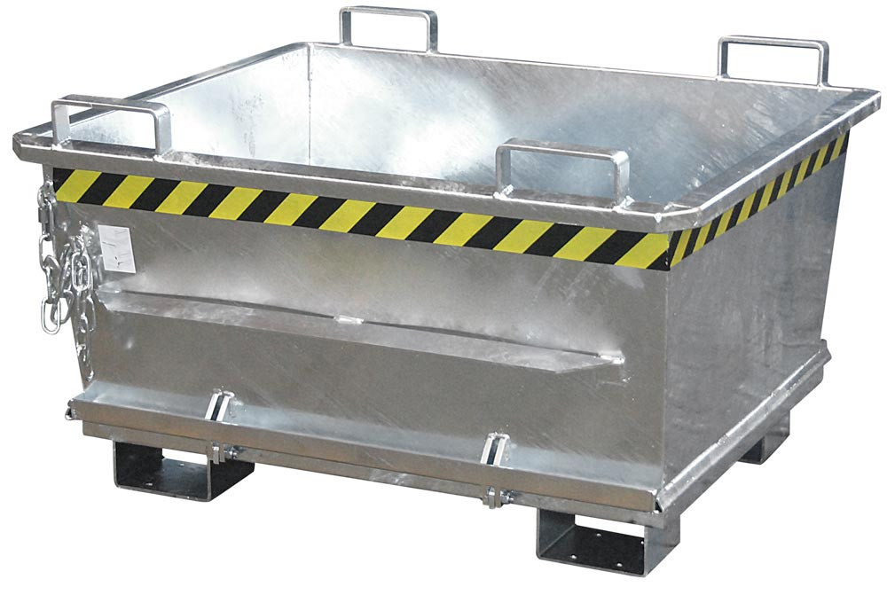 ∙ Entriegelung der Bodenklappe per Seilzug vom Stapler aus ∙ Bodenklappe schließt beim Aufsetzen selbsttätig, 90° Öffnungsbereich ∙ Sicherung für Bodenklappe gegen Abrutschen und ungewünschtes Öffnen ∙ Aufnahme für Gabelstapler und Kran sowie mit Gabelhubwagen transportierbar ∙ Robuste Stahlblechkonstruktion: Wandstärke 3 mm, Bodenklappenstärke 4 mm ∙ Einfahrbügel an der Oberseite des Behälters, Einfahrtaschen an der Unterseite · Unterfahrhöhe 100 mm