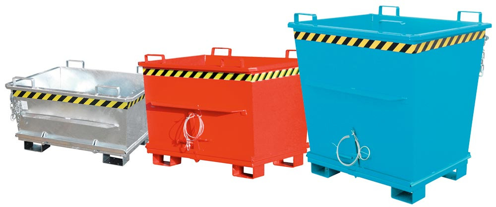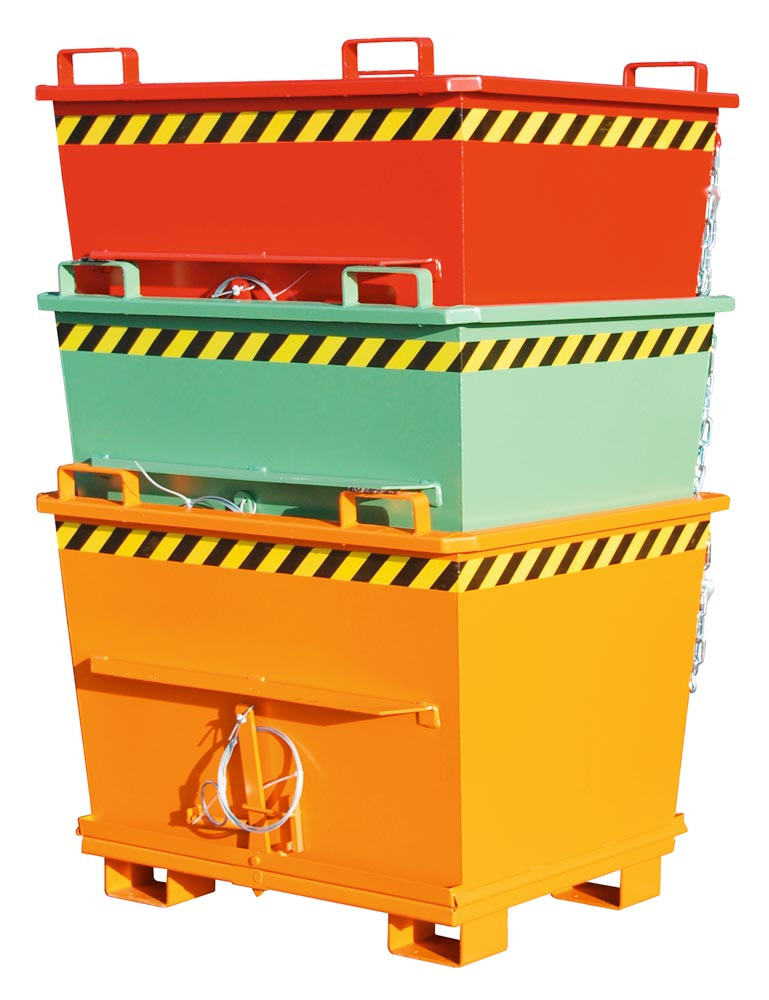 ∙ Entriegelung der Bodenklappe per Seilzug vom Stapler aus ∙ Bodenklappe schließt beim Aufsetzen selbsttätig, 90° Öffnungsbereich ∙ Sicherung für Bodenklappe gegen Abrutschen und ungewünschtes Öffnen ∙ Aufnahme für Gabelstapler und Kran sowie mit Gabelhubwagen transportierbar ∙ Robuste Stahlblechkonstruktion: Wandstärke 3 mm, Bodenklappenstärke 4 mm ∙ Einfahrbügel an der Oberseite des Behälters, Einfahrtaschen an der Unterseite · Unterfahrhöhe 100 mm