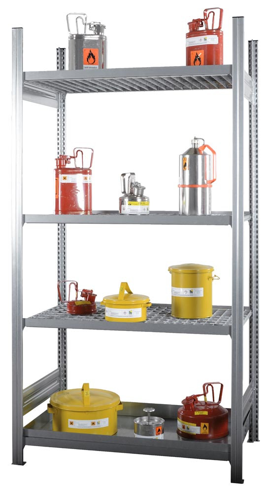 ∙ Zur Lagerung von wassergefährdenden und entzündbaren Flüssigkeiten mit 1 Wannenboden in der untersten Lagerebene ∙ Restliche Lagerebenen mit Gitterrostböden, höhenverstellbar im Raster von 25 mm ∙ Verzinkter, offener Regalrahmen mit Tiefenstreben ∙ Fachlast: 200 kg, Feldlast: bis max. 1200 kg
