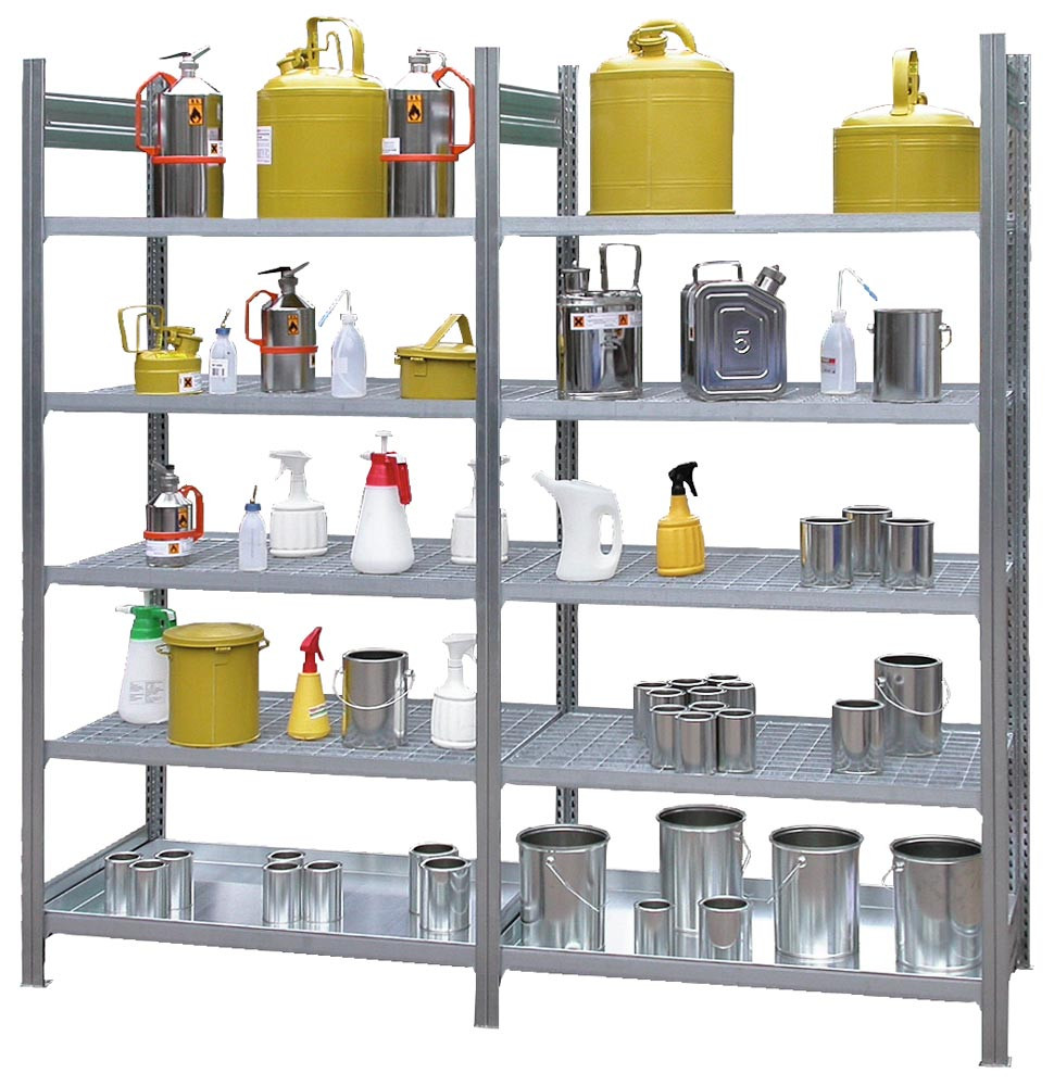 ∙ Zur Lagerung von wassergefährdenden und entzündbaren Flüssigkeiten mit 1 Wannenboden in der untersten Lagerebene ∙ Restliche Lagerebenen mit Gitterrostböden, höhenverstellbar im Raster von 25 mm ∙ Verzinkter, offener Regalrahmen mit Tiefenstreben ∙ Fachlast: 200 kg, Feldlast: bis max. 1200 kg