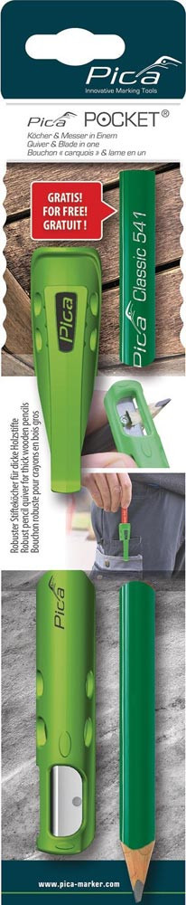 für Bleistifte · hält alle dicken Holzstifte wie z. B. Zimmermanns-/ Steinhauerstifte, egal ob oval, flachoval, dreikant · oder sechskantig · sogar den kleinsten Stummel · integriertes Spitzmesser · Taschenclip · mit extrem starkem Halt