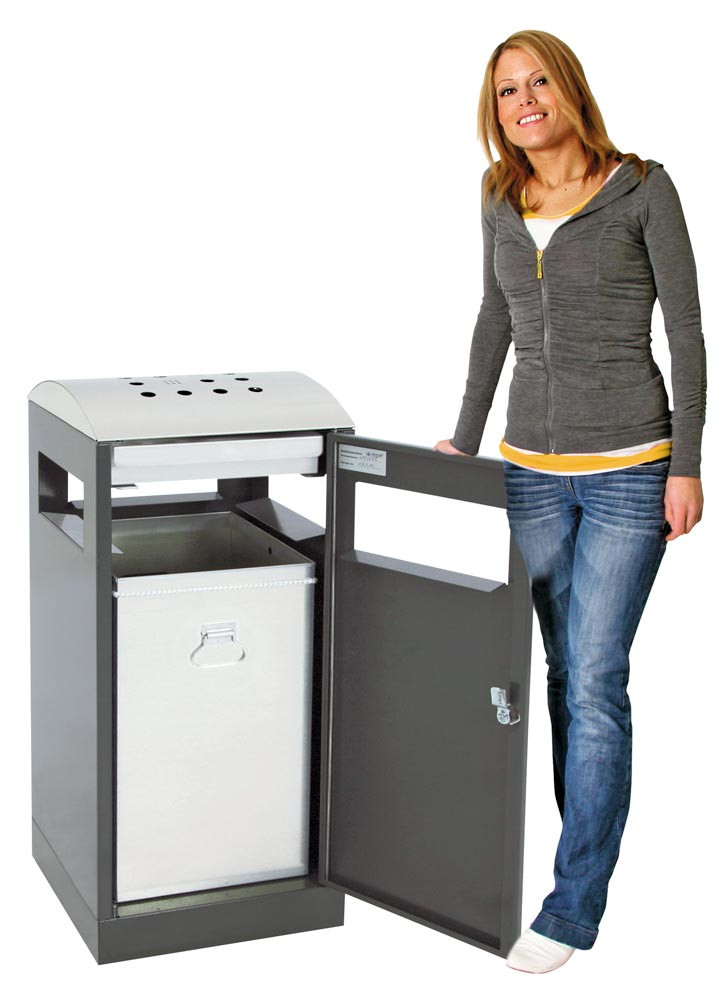 ∙ Korpus aus verzinktem Stahlblech, pulverbeschichtet RAL 7016 anthrazitgrau ∙ Mit verzinktem Innenbehälter ∙ Einwurföffnung an allen vier Seiten ∙ Niveauregulierung durch Stellfüße im Frontbereich ∙ Integrierte Ascherlade im oberen Bereich ∙ Gelochtes Kopfteil aus Edelstahl ∙ Flügeltüre per Vierkant verriegelbar ∙ Inklusive Montageprofil zu Bodenbefestigung