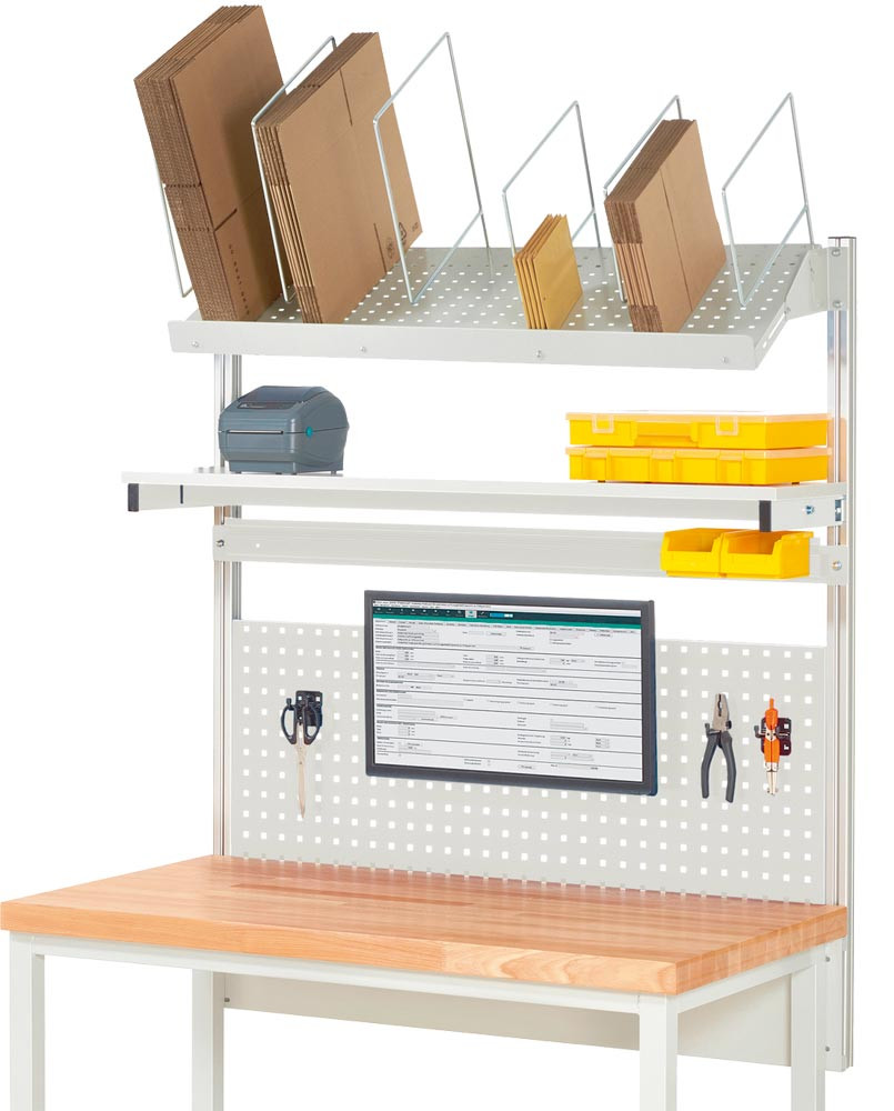 Komplettaufbau für Werkbank B 1500 mm mit Etagenbord, Lochplatte H 450 mm, Montageadapter, Kartonagemagazin,Halteschiene, RAL 7035 EP562837