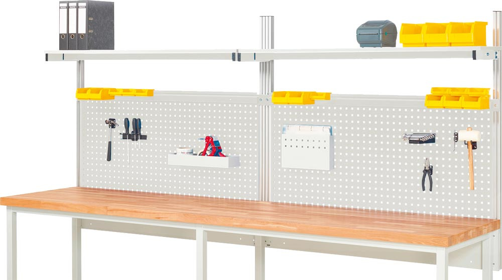 Komplettaufbau für Werkbank B 2000 mm mit Etagenbord, Lochplatte H 650 mm, Halteschiene, RAL 7035 EP562824