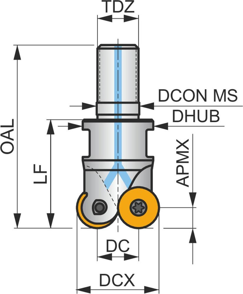 Plan-Kopierfräser mit doppelt negativer Geometrie welche 4 aus RD.. 12T3MOT oder RDHT 12T3MO-FA einseitige Wendeschneidplatte · Schneiddurchmesser bis maximal 35mm mit M16 Gewindeschaft für standardisierte modulare Trägerwerkzeuge · 42mm funktional und 65mm Einsatzlänge · durchgehende Kühlung zum Planfräsen · Kopierfräsen · Rampen · progressiven Tauchfräsen und helikalen Fräsen mit einer maximalen Schnitttiefe von 3mm