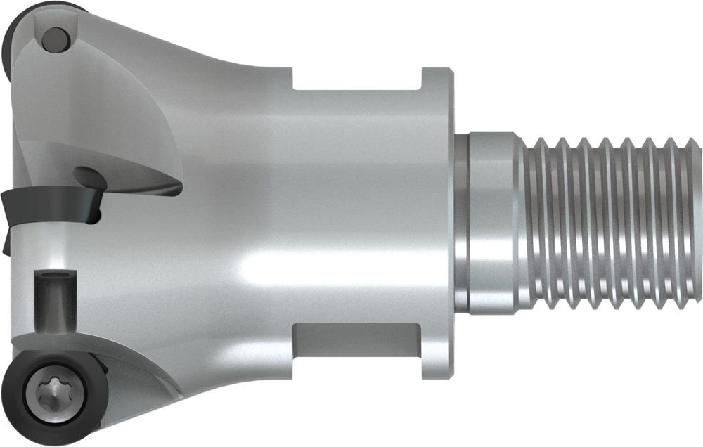 Plan-Kopierfräser mit doppelt negativer Geometrie welche 4 aus RD.. 1003MOT oder RDHT 1003MO-FA einseitige Wendeschneidplatte · Schneiddurchmesser bis maximal 42mm mit M16 Gewindeschaft für standardisierte modulare Trägerwerkzeuge · 42mm funktional und 65mm Einsatzlänge · durchgehende Kühlung zum Planfräsen · Kopierfräsen · Rampen · progressiven Tauchfräsen und helikalen Fräsen mit einer maximalen Schnitttiefe von 2.5mm