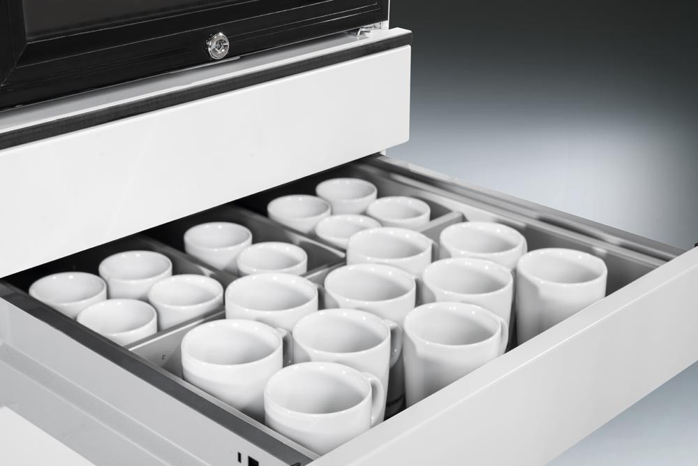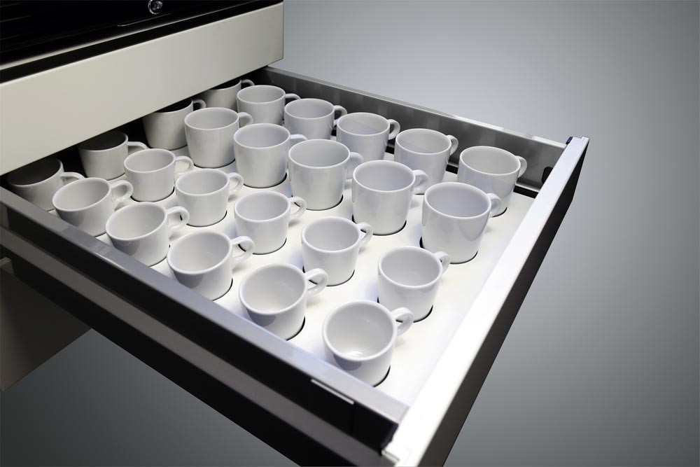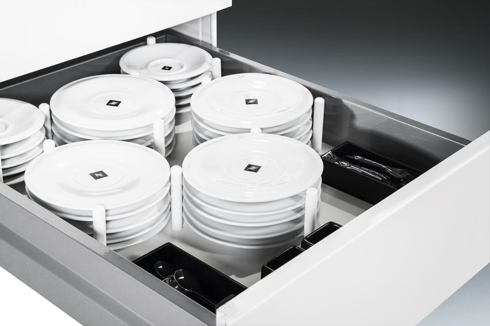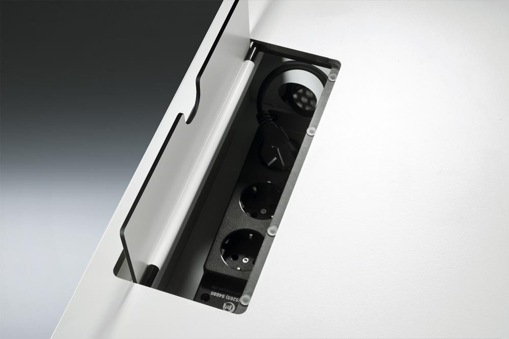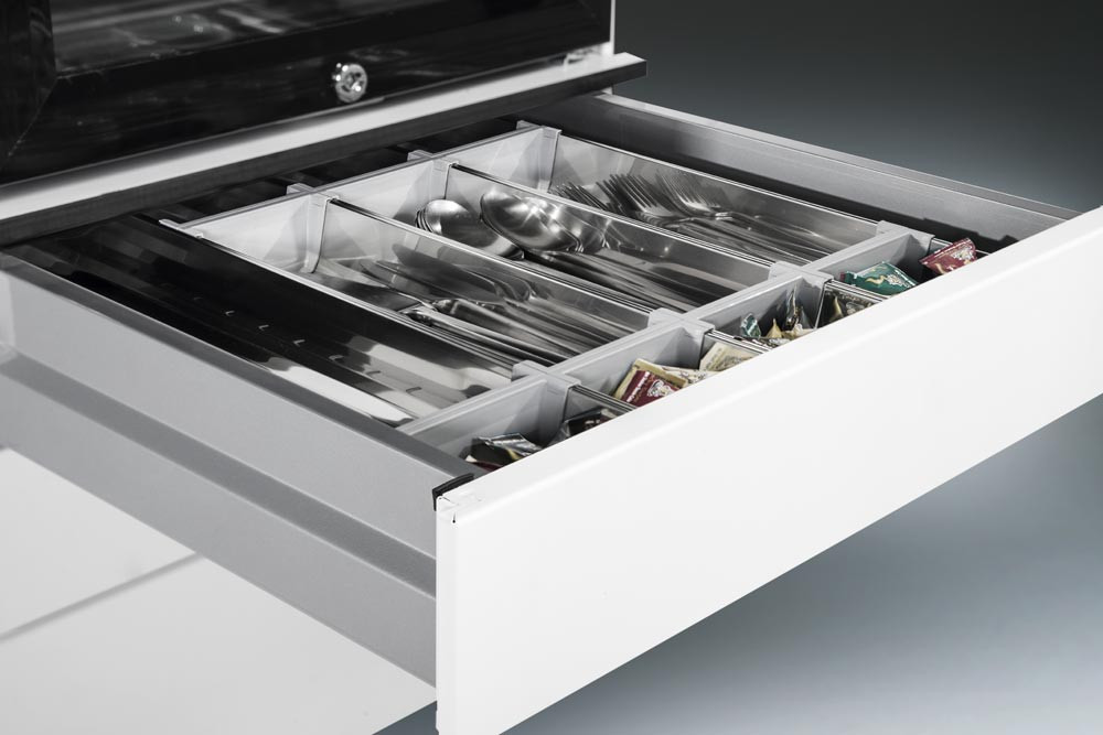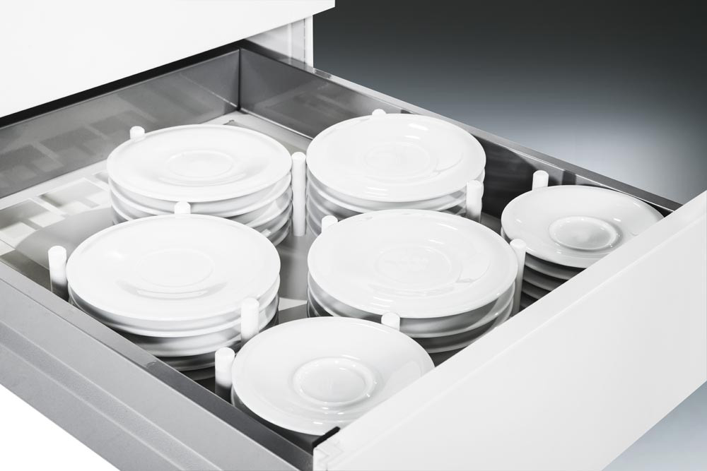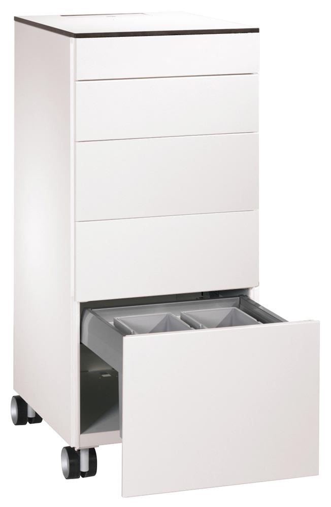 · Stahlkorpus doppelwandig, körperschallgedämpft für angenehmes Geräuschverhalten · HPL-Abdeckplatte · Kabelklappe in der Abdeckplatte mit 2 Steckdosen (230 V) und 3 m Zuleitung · Schubladen mit voll ausziehbaren Präzisionsschienen, End-Selbsteinzug und Soft-Stopp für sanfte Schließung · Variable Inneneinrichtung für die Schubladen · 4 Maxi-Lenkrollen, 2 davon feststellbar