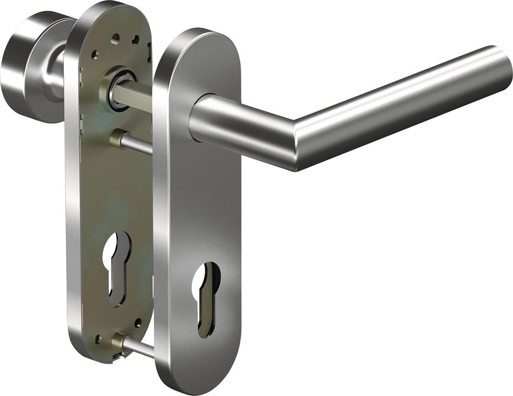 DIN links / rechts · Vierkant 8 mm · Entfernung 72 mm, Entfernung WC 78 mm · Drückergarnitur = beidseitig Drücker 8906 / Wechselgarnitur = außen Knopf 3020 / innen Drücker 8906 · für Türstärke 38-63 mm / WC = 37-42mm · geprüft nach DIN 1906 (Gebrauchs-Kategorie Klasse 4) · Hochhaltefedern einseitig (Durchgangsseite)