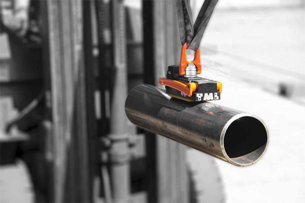 Leichter und Leistungsstarker Lasthebemagnet nach EN 13155 ausgelegt und mit Sicherheitsfaktor von 3:1 ∙ Für den Einsatz auf runden oder gewölbten Flächen mit einem Prisma ausgestattet, das optimalen Kontakt zu Rohren mit Durchmessern von 50 – 400 mm sicherstellt ∙ Dank der Thin Material Lifting-Technologie (TML) baut der Magnet ein optimales Kraftfeld auf ∙ Beeindruckende Haftkräfte – selbst bei dünnwandigen Materialien: bereits ab 2 mm Wandstärke haftet der Magnet zuverlässig ∙ Schwenkbarer und um 360 ° drehbarer Lastwirbel ermöglicht maximale Beweglichkeit beim Heben ∙ Haftfläche aus gehärtetem Stahl gefertigt und mit TiN-Beschichtung versehen