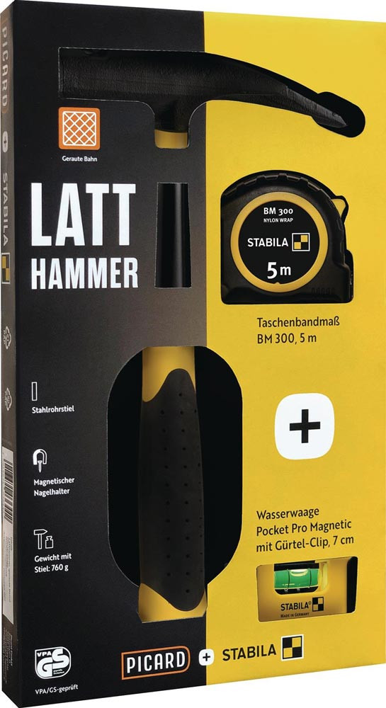 Box mit Stabila · DIN 7239 · Kopf schwarz pulverlackiert, korrosionsgeschützt · aus legiertem PICARD-Spezialstahl, sorgfältig gehärtet und angelassen · Chrom-Molybdän-Stahlrohrstiel · 2-Komponenten-Griff, ergonomisch und schwingungsreduziert · mit magnetischem Nagelhalterung · mit Kopfsicherung
