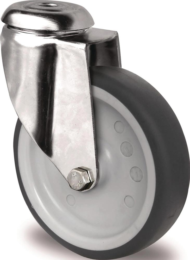 Lenkrolle Rad-Ø 100 mm Tragfähigkeit 100 kg Rückenlochbefestigung Polypropylen Gleitlager Edelstahl TPE grau