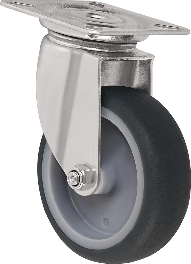 Apparaterolle · galvanisch blau verzinktes Stahlblechgehäuse · korrosionsunempfindlich · zweireihiger Kugelkranz im Gabelkopf · thermoplastische Gummibereifung (grau) auf Kunststoff-Felge · Gleitlager · mit Plattenbefestigung
