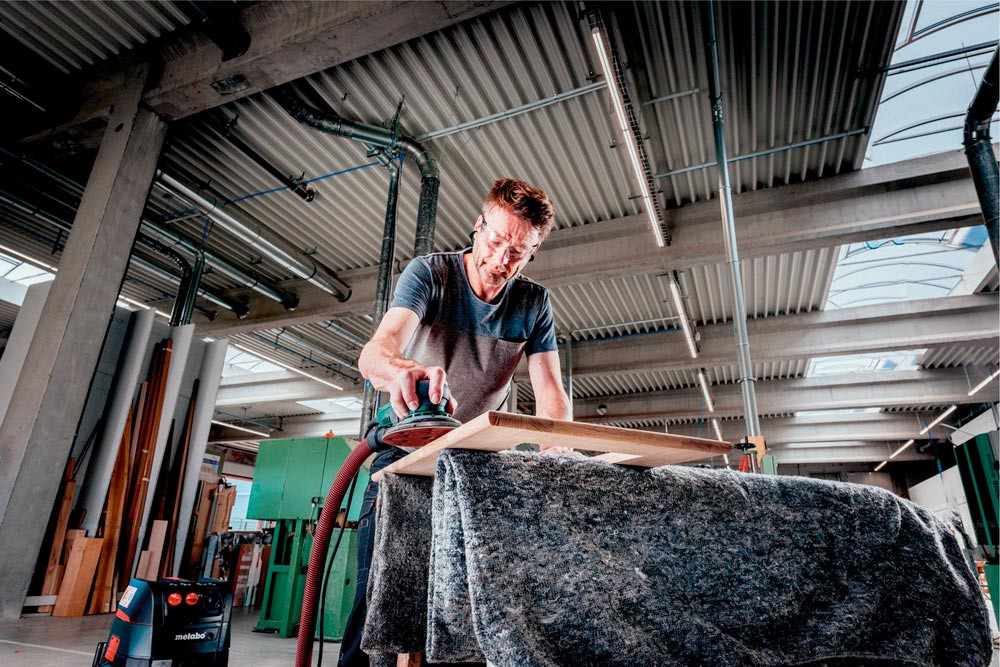 Ausführung: Sehr leichter und handlicher Schleifer mit Vario-Tacho-Constamatic (VTC)-Vollwellenelektronik zum materialgerechten Arbeiten ∙ Brushless-Motor für höchste Effiziens auch im Dauerbetrieb garantiert ∙ Klett-Stützteller mit Multilochung für effektive Absaugung ∙ Rutschfester Paddle-Schalter mit Totmannfunktion für sicheres Starten, separater Hauptschalter ∙ Überlastschutz ∙ Staubsauger-Anschlussmöglichkeit ∙ Elektronische Voreinstellung des gewünschten Drehzahlbereichs ∙ Motor- und Tellerbremse ermöglicht schnelles Ablegen der Maschine