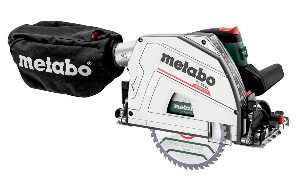 Ausführung: Tauchkreissäge mit Brushless-Motor für kraftvolles Eintauchen und präzise Sägeschnitte bis 66 mm Tiefe ∙ Spielfreier, justierbarer Sitz auf den Führungsschienen von Metabo und anderen Herstellern für exakte Schnittergebnisse ∙ Vielseitiger Einsatz durch variable Drehzahl für unterschiedliche Materialien ∙ Doppelanzeiger für exaktes Einstellen der Schnitttiefe mit und ohne Führungsschiene ∙ Mit Hinterschnittfunktion für passgenaue Übergänge, 0°- und 45°-Position nachjustierbar für höchste Schnittgenauigkeit ∙ Schnelles und einfaches Wechseln des Sägeblatts durch Hebel für einrastende Tauchposition und Spindelstopp ∙ Sichtfenster in der Schutzhaube für exakte Schnittführung ∙ Auslaufbremse stoppt das Sägeblatt besonders schnell und erhöht die Sicherheit ∙ Staubarmes Sägen dank dem großvolumigen Staubsack oder durch Anschließen eines Saugers ∙ Sägespäne-Auswurfstutzen für jede Arbeitsposition individuell dreh- und arretierbar