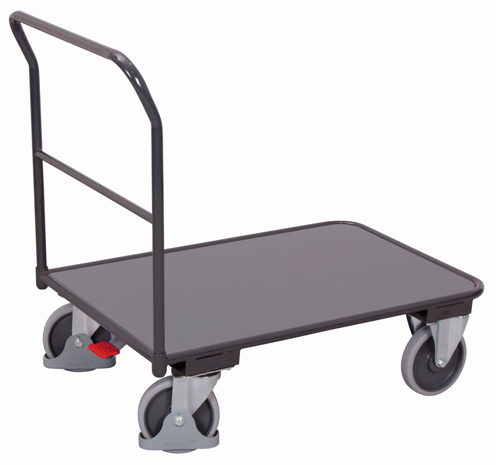 · Schweißkonstruktion aus Stahlrohr · RAL 7016 anthrazitgrau pulverbeschichtet · Schlag- und kratzfest · Ladefläche Holzwerkstoffplatte mit Buchendekor · 2 Lenk- und 2 Bockrollen · Lenkrollen gemäß EN 1757-3 mit zentraler Fußbremse EasySTOP und Fußschutz · Thermoplastische Vollgummi-Bereifung, grau "spurlos" · Naben mit Präzisions-Rillenkugellager und Fadenschutz