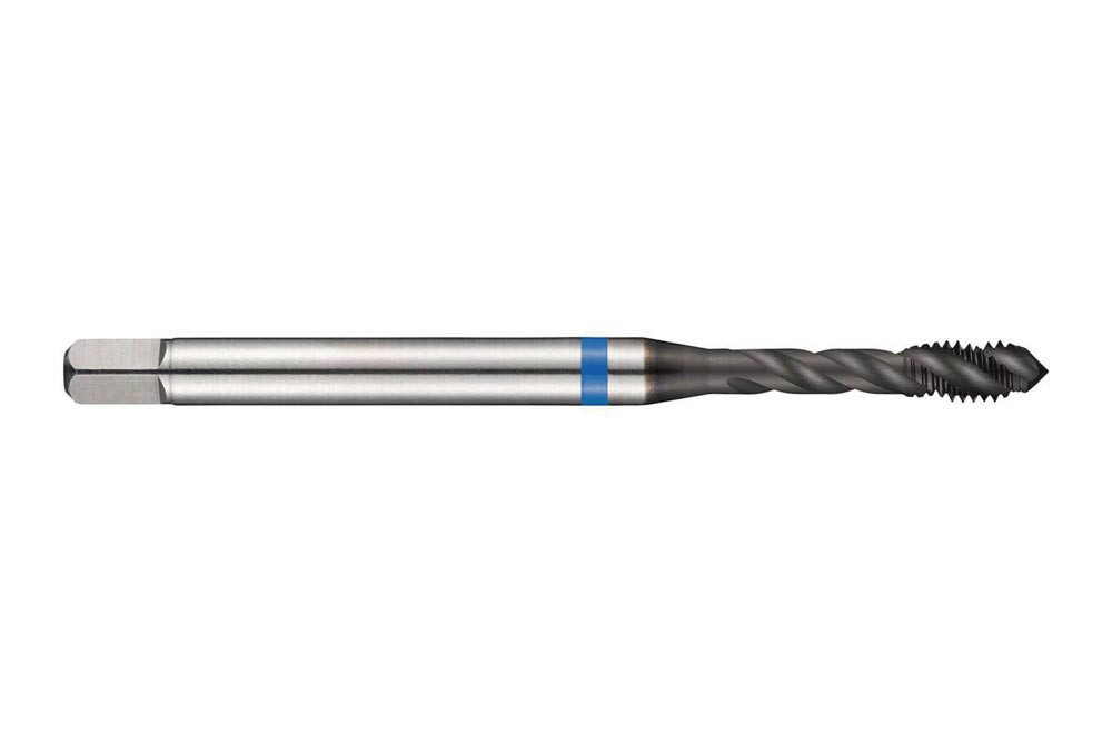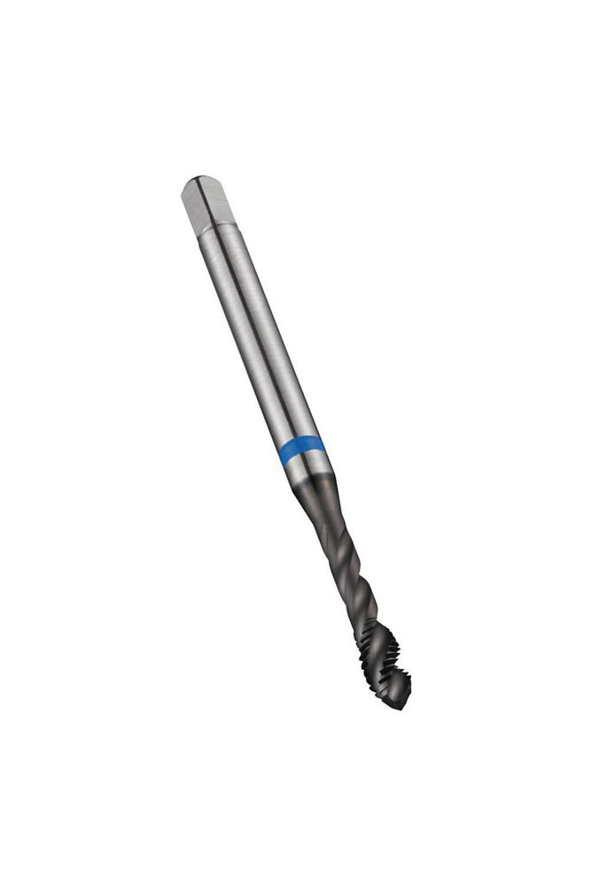 Spiral genuteter Gewindebohrer Blue Shark · Anschnittform C mit 2-3xP Gewindeanschnitt · ISO-Metrisches Gewinde M5 mit 0.80 mm Steigung und 6H Toleranzklasse · Abmessungen nach DIN 371 Standard mit 6.0mm Schaft und 4.9mm Vierkantantrieb · HSSE-PM mit Super-B Beschichtung und 40° Helixwinkel 2.5xD Sacklochgewinde in Ferritischer · Martensitischer und Austenitischer Edelstahl