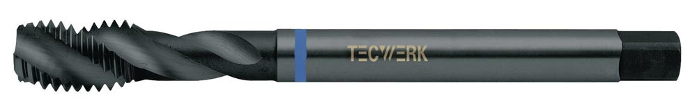 HSS-Co · Form C · Typ VA · nitriert und vaporisiert · Blauring · mit Rechtsdrall 40° · Flanken hinterschliffen · metrisches ISO-Gewinde · DIN 13 Blatt 1 · Toleranzfeld ISO2 (6H) · für Sacklochgewinde · für rost-, säure- und hitzebeständige Stähle > 850 N/mm² Festigkeit