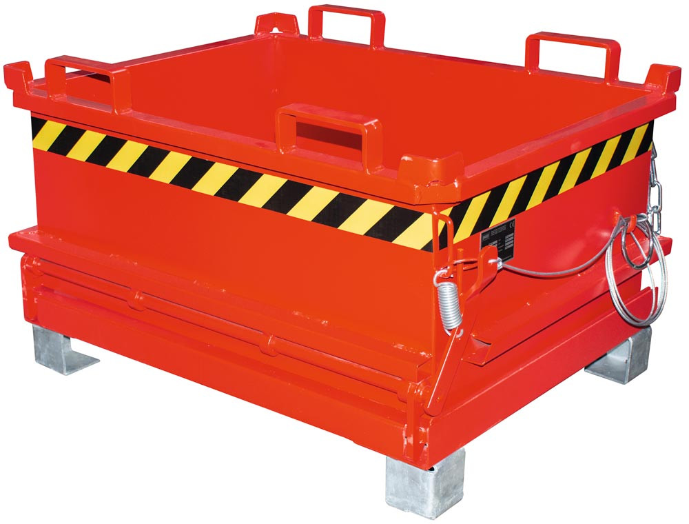 · Ideal überall dort einsetzbar, wo wenig Platz ist · Robuste Stahlkonstruktion mit glatten Innenwänden · Entriegelung der Bodenklappe per Seilzug vom Staplersitz · Bodenklappe schließt beim Aufsetzen selbsttätig · Sicherung gegen unbeabsichtigtes Abrutschen und Öffnen der Bodenklappe · Durch 100 mm Unterfahrhöhe mit Gabelhubwagen transportierbar · 3-fach stapelbar