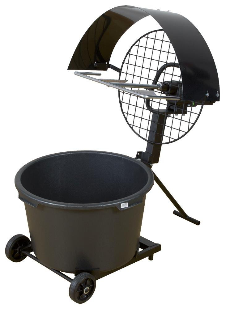 Mischstation mit durchzugsstarkem Universalmotor ∙ IntegriertesTransportgestell mit Zugstange für den mobulen Einsatz ∙ Schalter mit Staubschutz und mechanische Sicherheitskupplung ∙ Werkzeugloses Trennen von Motor und Untergestell für einachen Transport und platzsparende Aufbewahrung ∙ Mit Schutzgitter zum einfachen, sicheren Entleeren von Sackware ∙ Ausklappbarer Maschinenarm für einfachen Behälterwechsel ∙ Standsicher durch Verdrehschutz für Mischkübel