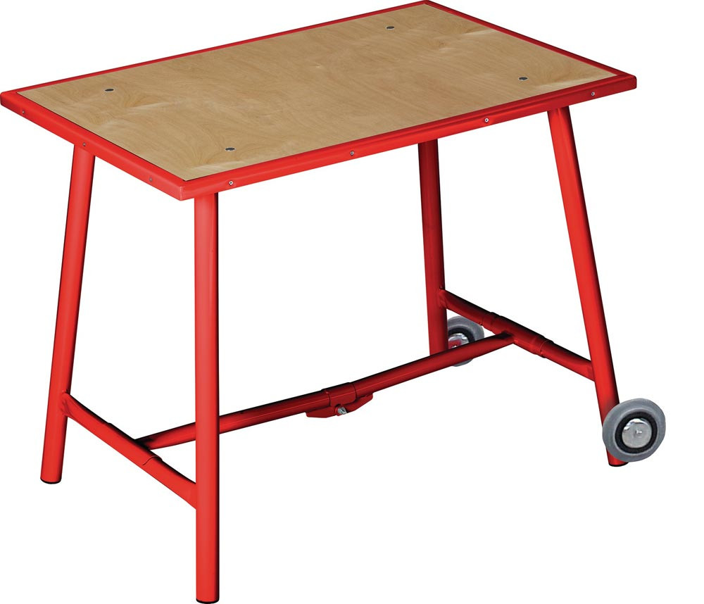 Untergestell aus stabilem Stahlrohr · anklappbar · große Räder (zusammengeklappt und aufgebaut leicht zu rollen) · Buchen-Multiplexplatte mit Kantenschutz · äußerst stabil