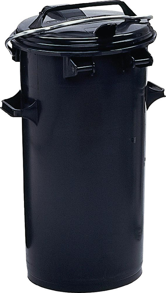 Kunststoff, hochwertiges HDPE-Polyethylen · Farbe anthrazit · mit Bügel · nach DIN 6628 · für staubfreie Entleerung · gut entleerbar durch konische Behälterform · unempfindlich gegen Säuren, Laugen und Witterungseinflüsse · nahtlos gefertigt, ohne scharfe Kanten