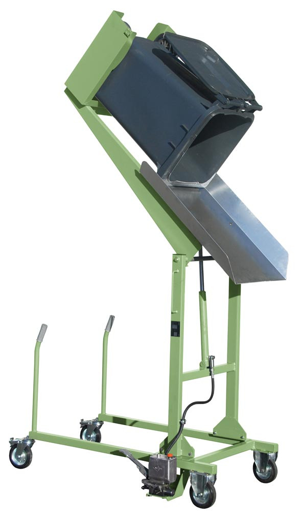 · Zur Entleerung und Reinigung von 120- und 240 Liter Mülltonnen · Kippwinkel bis 135° · Ausschütthöhe ca. 1480 mm · 2 Lenk- und 2 Bockrollen aus Vollgummi, Ø 180 mm, Lenkrollen mit Feststeller, Bauhöhe 225 mm · Traglast 110 kg