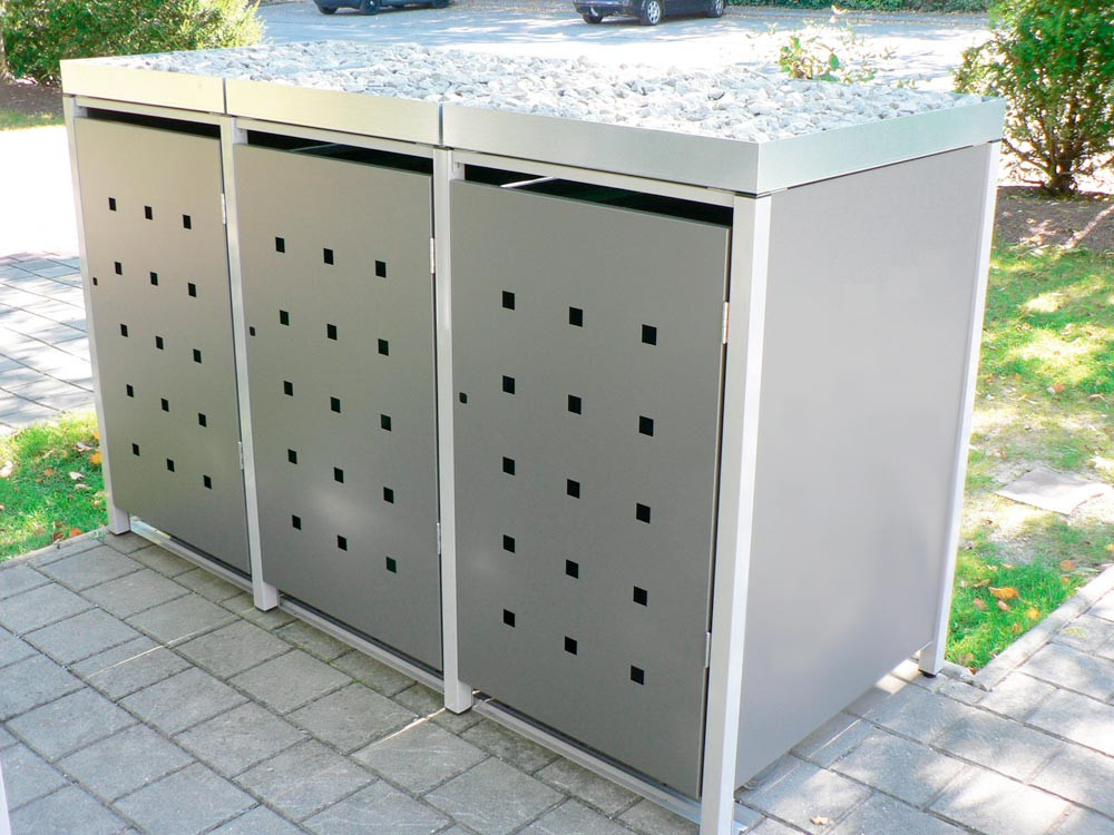 Mülltonnenverkleidung aus feuerverzinktem Stahlblech, BxTxH 1960x830x1215 mm m. Pflanzdach, für 3 Tonnen, Stanzung 3/5, Farbe RAL7004/RAL9007