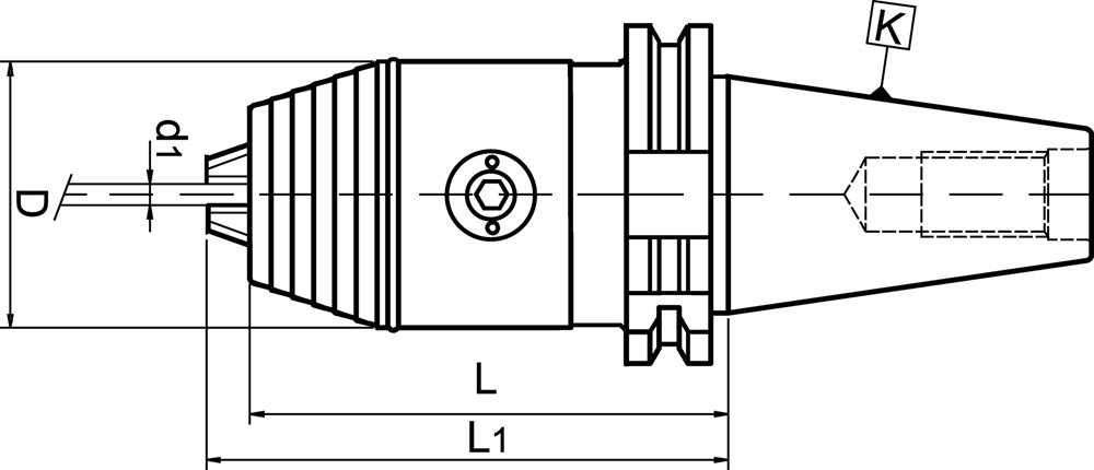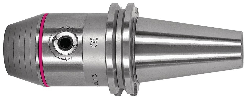 mit Steilkegel DIN 69871 Form A · zum Einsatz auf CNC-Maschinen und Bearbeitungszentren · schneller, unkomplizierter Werkzeugwechsel durch Betätigung eines Kegeltriebs mittels seitlich einsteckbarem Quergriff-Stiftschlüssel, so dass ein Werkzeugwechsel auch direkt in der Maschine möglich ist · kein Öffnen des Futters während des Laufs oder bei abruptem Spindelstop · Schaft und Futter bilden eine Einheit, dadurch kurze, stabile und schwingungsfreie Ausführung · Präzisionsausführung mit hoher Rundlaufgenauigkeit max. 0,02 mm · für Rechts- und Linkslauf