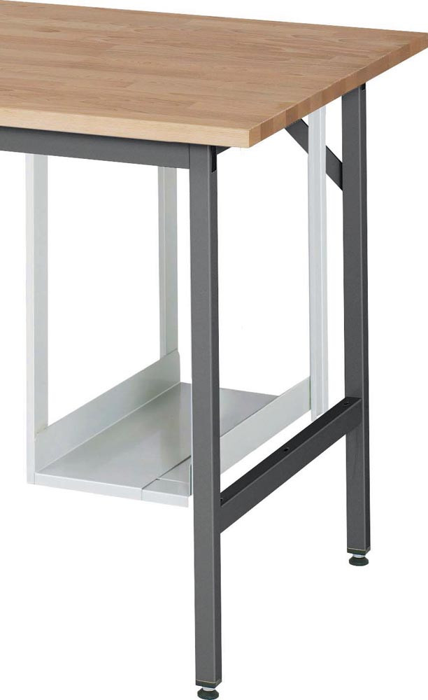 zur einfachen Nachrüstung der Rau Arbeitstische und Werktische · Montage direkt an der Tischplatte · Stahlblech lichtgrau, RAL 7035 · einstellbare Breite des Halters von 150-230 mm · Tragfähigkeit 10 kg