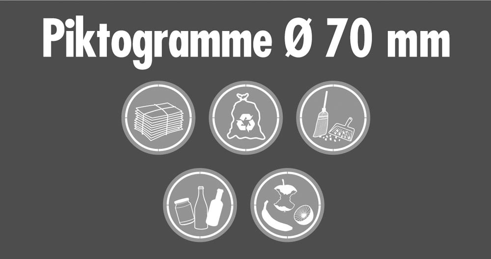 Piktogramme, Durchm. 70 mm, selbstklebend, wasserfest, transparent, Aufdruck weiß, Set mit 5 Stück EP511178