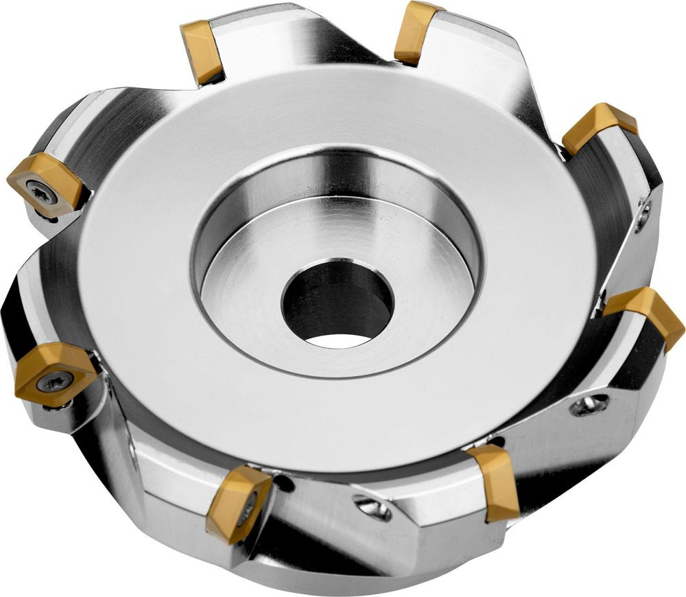 Planfräser mit positiver/negativer Geometrie zum spannen von 7 Stück SNKT 1205AZ.. oder SNMT 1205AZ.. doppelseitigen Wendeschneidplatten · Schnittdurchmesser 100 bis maximal 115mm mit 45° Anstellwinkel und 32mm Verbindungsbohrung gemäß DIN 8030-A · 50mm Überstandslänge · Kühlkanalbohrung zum Planfräsen und Entgratfräsen mit einer maximalen Schnitttiefe von 6.5mm