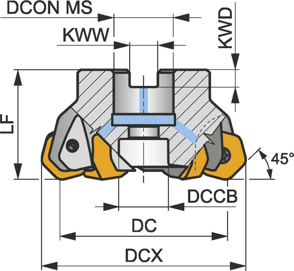 Planfräser mit doppelt negativer Geometrie zum spannen von 8 Stück HNGX 0906AN.. oder XNGX 0906AN.. doppelseitigen Wendeschneidplatten · Schnittdurchmesser 100 bis maximal 111.7mm mit 45° Anstellwinkel und 32mm Verbindungsbohrung gemäß DIN 8030-A · 50mm Überstandslänge · Kühlkanalbohrung und ungleiche Teilung zum Planfräsen · Rampen · progressiven Eintauchen und Entgratfräsen mit einer maximalen Schnitttiefe von 5.0mm