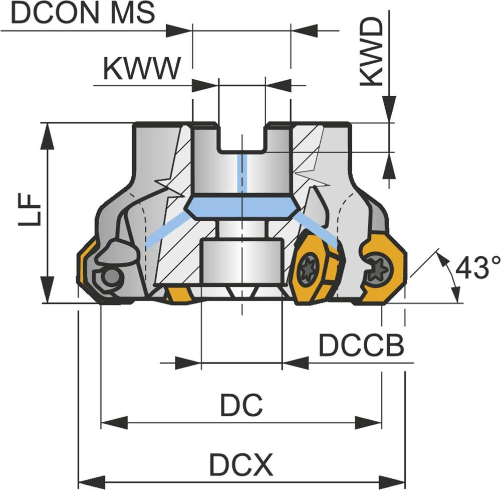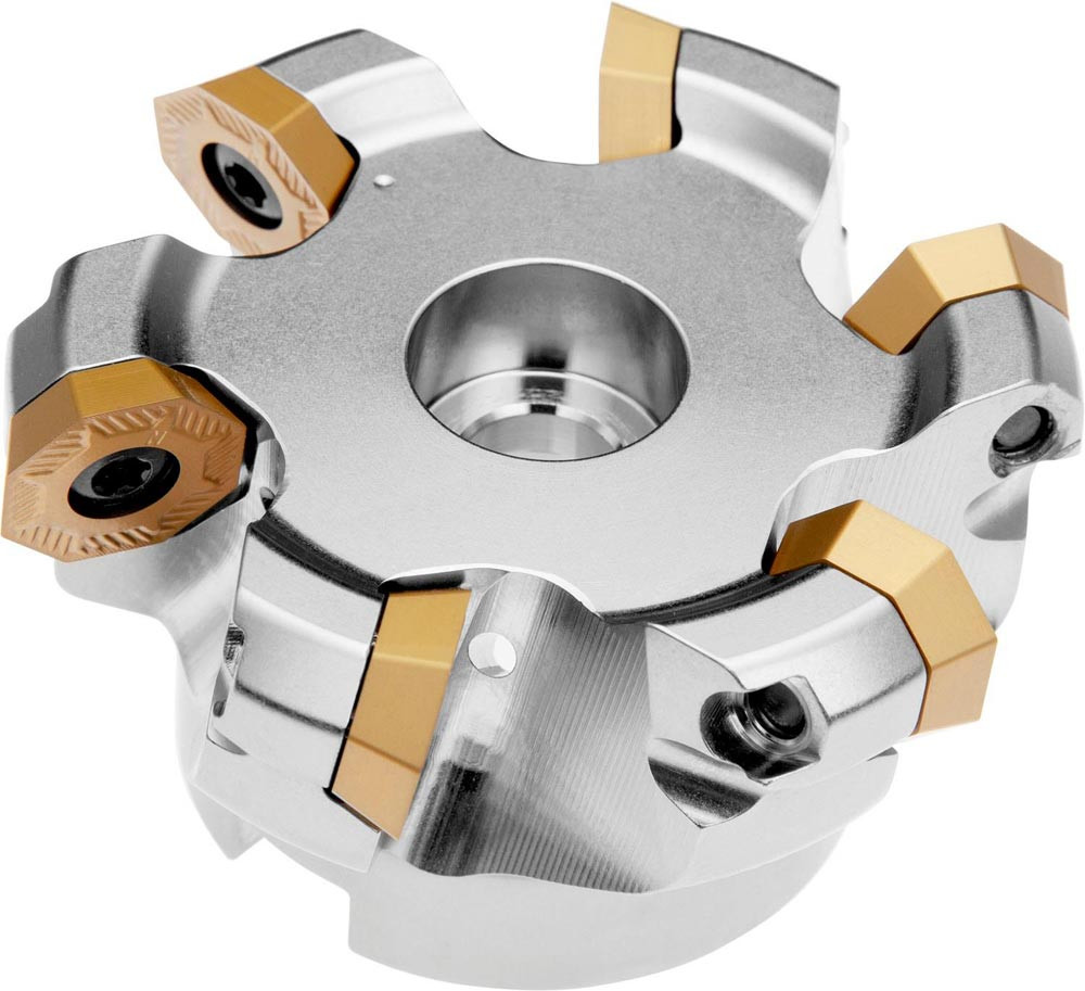 Planfräser mit doppelt positive Geometrie zum spannen von 8 Stück OEHT 0604AE.. · REHT 1604M0.. oder XEHT 0604AE.. einseitigen Wendeschneidplatten · Schnittdurchmesser 100 bis maximal 109.9mm mit 43° Anstellwinkel und 32mm Verbindungsbohrung gemäß DIN 8030-A · 50mm Überstandslänge · Kühlkanalbohrung und ungleiche Teilung zum Planfräsen und Entgratfräsen mit einer maximalen Schnitttiefe von 3.3 (9.9)mm