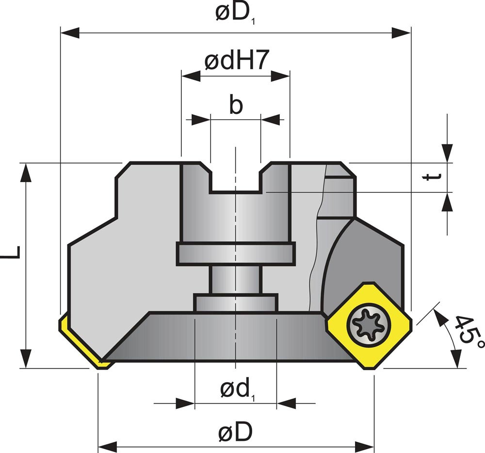 45° · vernickelte Ausführung · mit Innenkühlung · mit hochpositiven Spanwinkel, vielseitig einsetzbar · für hohe Vorschübe und Schnitttiefen bis 6 mm · für Wendeschneidplatte SE1204 AF