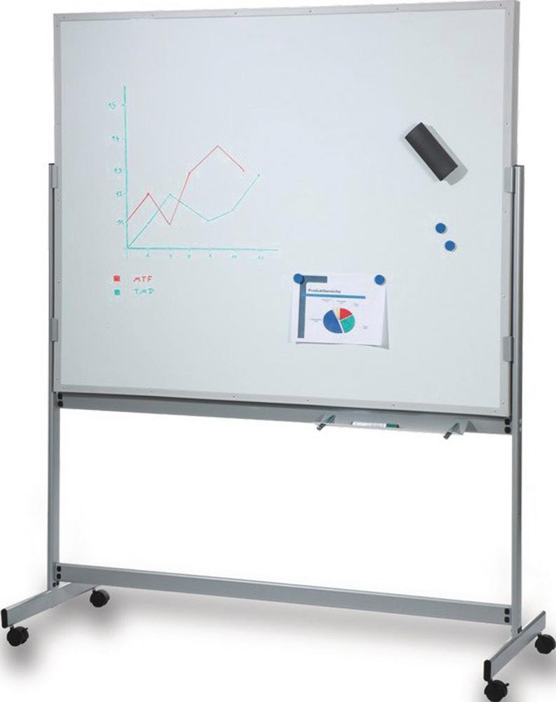 mobile Tafel · standfestes Stahlgestell 60 x 20 mm · mit 4 Lenkrollen 2 davon feststellbar · Vorderseite aus Kunststoff, Polypropylen grau, mit 9 Schienen und Ablagefach · für Auftragstaschen oder Belege DIN A4 Einstecktiefe 210 mm, Sichtrand 96 mm · mit individueller Beschriftungsmöglichkeit (Zubehör) · Rückseite mit Whiteboardblech magnethaftend, mit Stiftablage