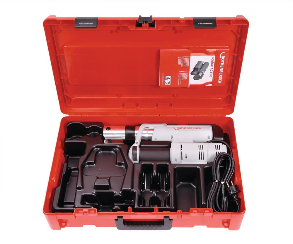 Elektrohydraulische Pressmaschine für Netzbetrieb zum systemabhängigen Verpressen von Fittingen Sie ist leicht · handlich und für die Serienfertigung von Fittingverbindungen auf der Baustelle geeignet. Durch die CFT-Technologie garantiert für die ROMAX AC ECO eine konstante axiale Presskraft bei 32-34 kN für 10.000 Presszyklen. Ergonomisch dank gummiertem Griff und ausgewogener GewichtsverteilungCFT-Technologie für konstante axiale SchubkraftSchneller Pressvorgang von nur etwa 5 Sekunden5m Kabellänge Elektrohydraulische Pressmaschine für Netzbetrieb zum systemabhängigen Verpressen von Fittingen bis Ø 110 mm (systemabhängig) mit 32 - 34 kN.