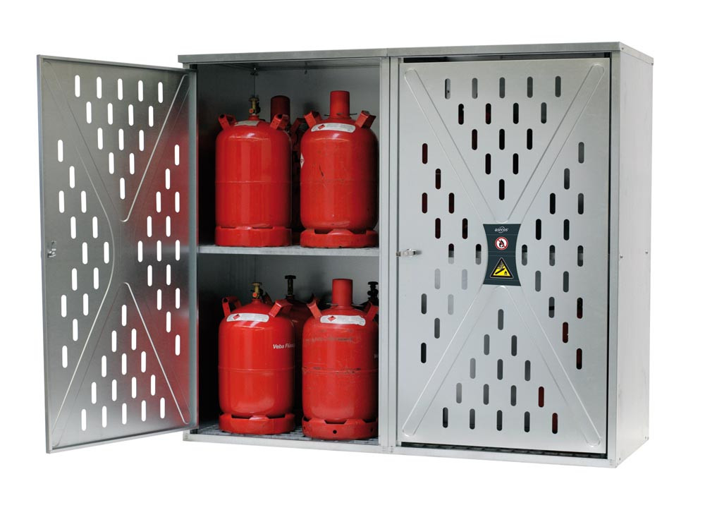 ∙ Zur sicheren Aufbewahrung von Propangasflaschen im Außenbereich gemäß TRF ∙ Komplett aus feuerverzinktem Stahlblech ∙ Mit abschließbarer Tür zum Schutz vor unbefugter Benutzung ∙ Zerlegte Lieferung mit Rückwand, Bodenrost und Zwischenrost