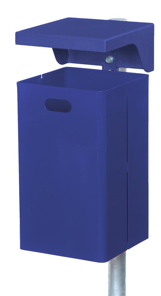 Rechteck-Abfallbehälter mit Abdeckhaube, ca. 40 L, feuerverzinkt sowie kpl. zus. pulverbeschichtet blau RAL 5013, ohne Ascher