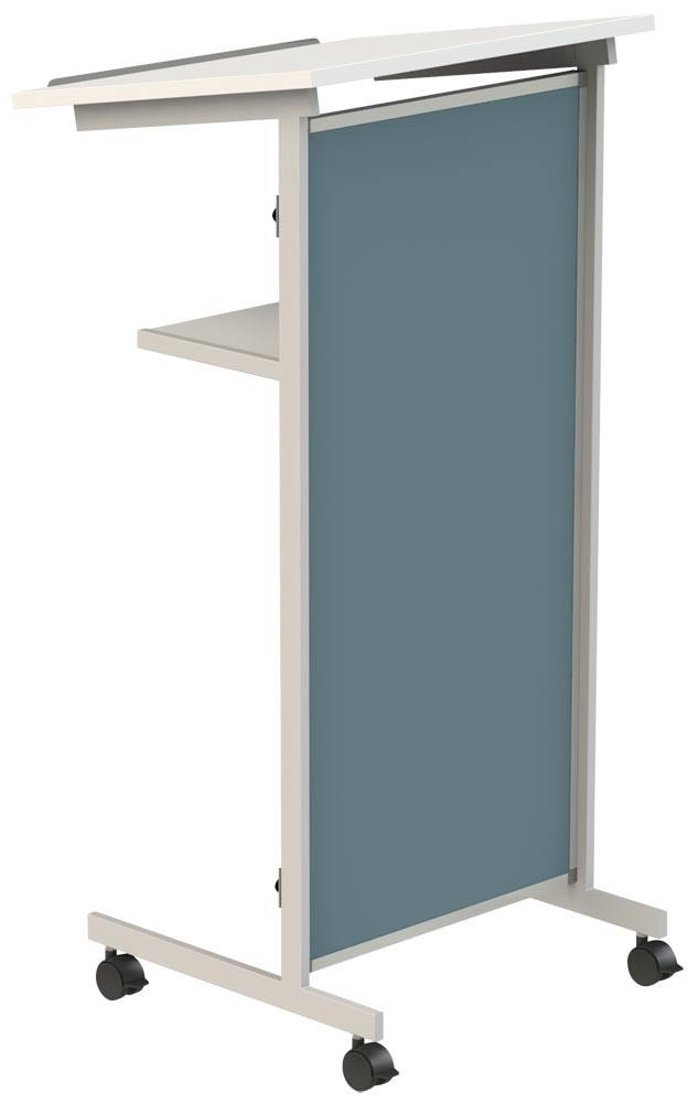 ∙ Konzipiert für Präsentationen, Konferenzen oder als rückenschonender Arbeitsplatz im Büro ∙ Siberfarbenes Stahlrohrgestell mit geneigter Arbeitsplatte mit Anschlagsseite, Mittelablage und vier Feststell-Lenkrollen ∙ Geschlossene Frontfläche mit Textilbezug in königsblau oder hellgrau, pinbar