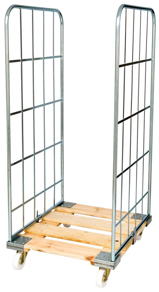 ∙ 2 Seitenwände, galvanisch blau verzinkt ∙ Robuste Rohrkonstruktion Ø 22 mm ∙ Ausfachungen mit 4 senkrechten und 4 bzw. 5 waagerechten Flacheisen 12 x 3 mm ∙ Bodenplatte mit 2 Lenk- und 2 Bockrollen Ø 108 mm aus Polypropylen mit Fadenschutz und verschraubter Radachse