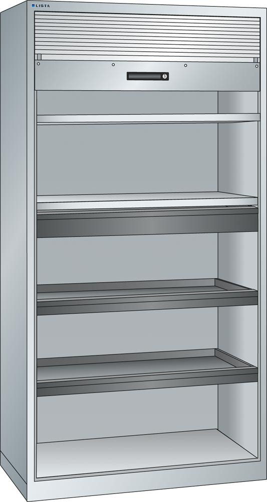 Rollladenschrank, BxTxH 1000x580x1950 mm, 2 Verstellböden, 2 Auszugböden, 1 Schublade, RAL 5012, Rolllade grau EP514694