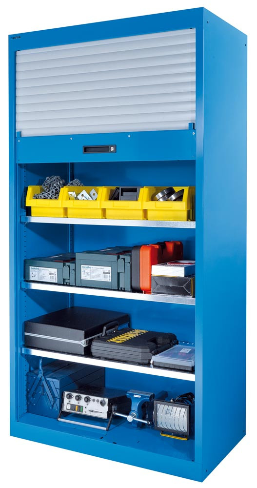 Rollladenschrank, BxTxH 1000x580x1950 mm, 2 Verstellböden, 2 Auszugböden, 1 Schublade, RAL 5012, Rolllade grau EP514694